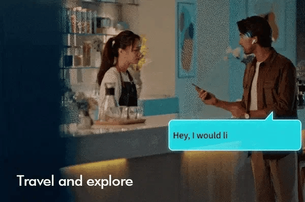 Give one earbud to a friend and speak naturally in real time in two languages.